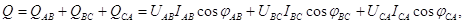 Як і при з’єднанні зіркою активна і реактивна потужності при з’єднанні трикутником дорівнюють відповідно сумі активних і реактивних потужностей фаз: