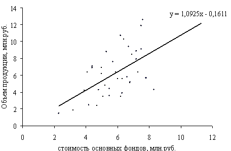 В целом при последующем росте стоимости основных фондов на предприятии будет наблюдаться рост объема продукции. Например, если стоимость основных фондов приборостроительного предприятия будет равна 10 млн. руб., то в среднем объем произведенной им продукции составит на сумму 10,76 млн. руб.