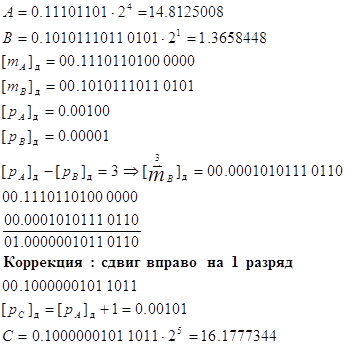 то выдать число B и закончить выполнение. Если 0 £ Dp < 14, то сдвинуть мантиссу числа B на çDpç разрядов вправо. Если 0 > Dp > -14, то сдвинуть мантиссу числа А на çDpç разрядов вправо. Порядок ответа