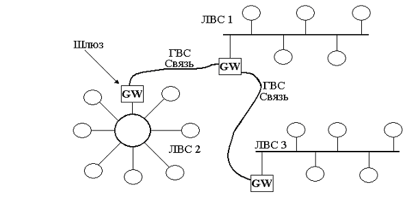 На рис.2 показаны три ЛВС, соединенные посредством двух связей глобальной вычислительной сети (ГВС). Узлы каждой ЛВС могут контактировать друг с другом непосредственно. Когда же узел ЛВС 1 связывается с узлом ЛВС 3, данные должны пройти через два шлюза. Узлы различных ЛВС должны иметь информацию о наличии шлюза и при необходимости взаимодействовать с ним. Другое общепринятое название шлюза маршрутизатор. Однако при использовании данного термина следует помнить, что любой маршрутизатор является шлюзом, но не всякий шлюз является маршрутизатором.