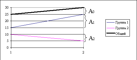 Поскольку Y0 = Yi , то в соответствии со свойством аддитивности линейных функций, A0 = Ai , т.е. единичное приращение суммарного сбыта состоит из единичных приращений (с обоими знаками) сбыта всех групп продукта, включенных в ассортимент предприятия, что и проиллюстрировано ниже на примере, где общий объем сбыта состоит из двух групп. Наглядно видно, что суммарное приращение сбыта A0 состоит из A1 и A2 , причем группа 1 обеспечивает положительный прирост сбыта, а группа 2 - отрицательный, т.е. тянет предприятие назад.